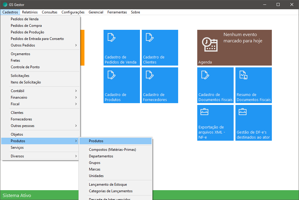 No menu principal, acesse a tela Cadastro de produtos pelo caminho Cadastros > Produtos > Produtos: