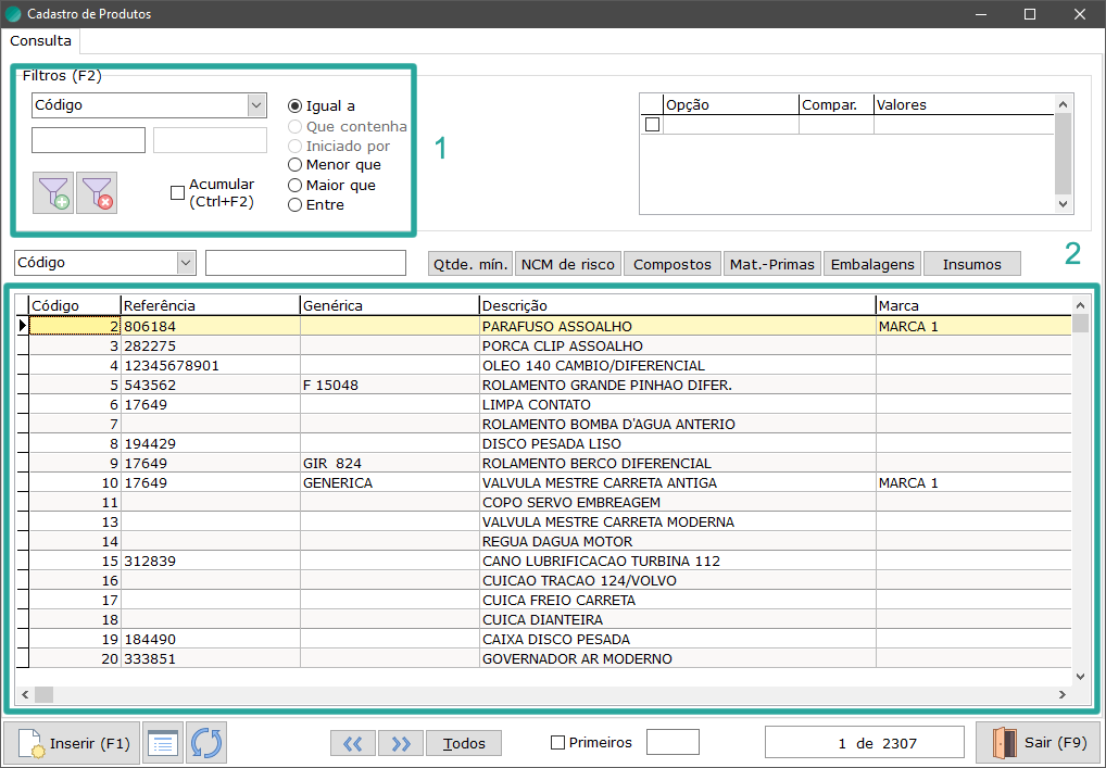 Utilize um ou mais filtros (1) ou apenas clique no espaço da listagem para buscar todos os produtos cadastrados (2).