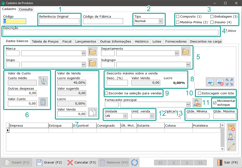 - Movimentar estoque: Apenas desmarque este campo caso o produto em questão não precise controlar o estoque (aconselhável apenas para produtos de insumo ou casos específicos).