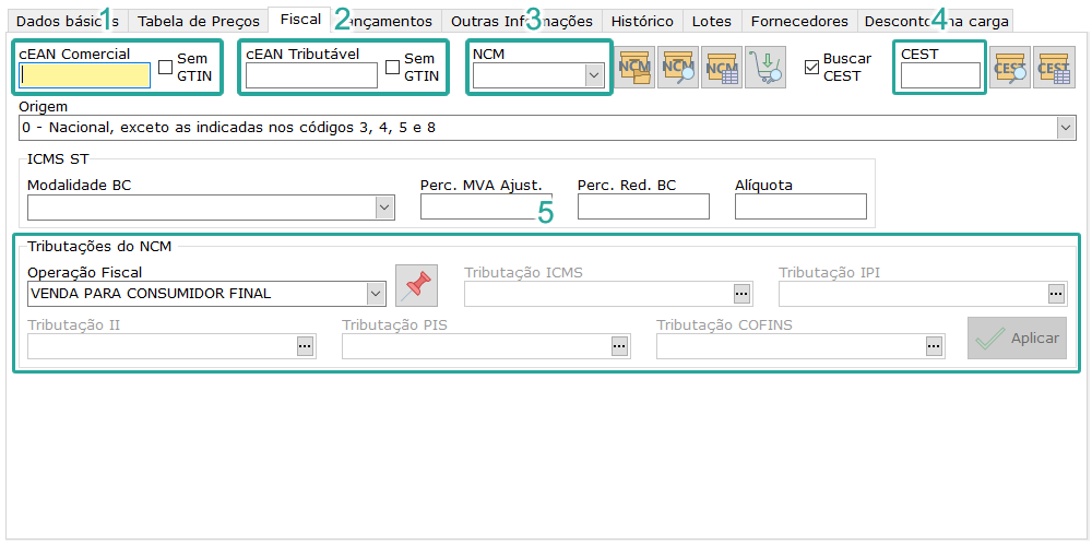 Na aba fiscal, os principais campos são: