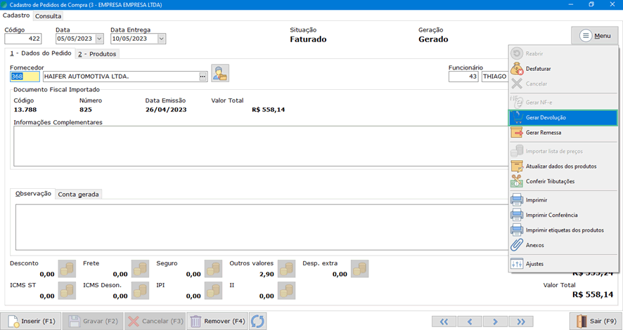 Na tela de Cadastro de Pedidos de Compra, acesse a compra que deseja fazer devolução do produto, clique em Gerar Devolução no Menu: