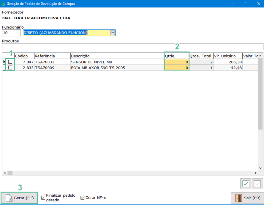 - Quantidade: preencha a quantidade do produto a ser devolvido.