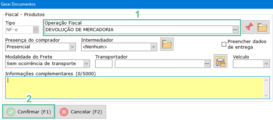 - Operação Fiscal: selecione a operação fiscal, nesse caso será devolução.