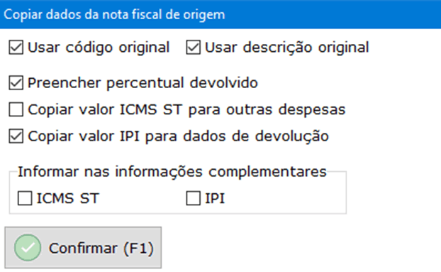Selecione os campos que deseja copiar da nota fiscal de origem e clique em Confirmar.