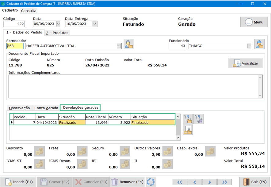 Preencher dados da NF-e Devolução